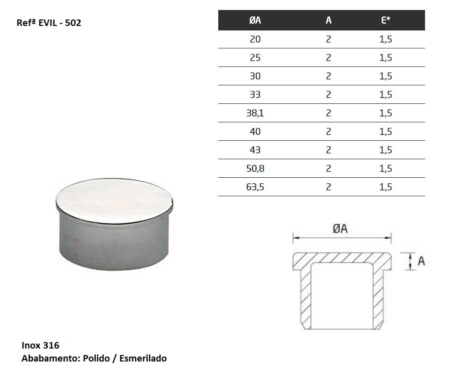 Medidas: Ø20 - Ø25 - Ø30 - Ø33 - Ø40 - Ø48,3 - Ø50,8 - Ø63,5mm